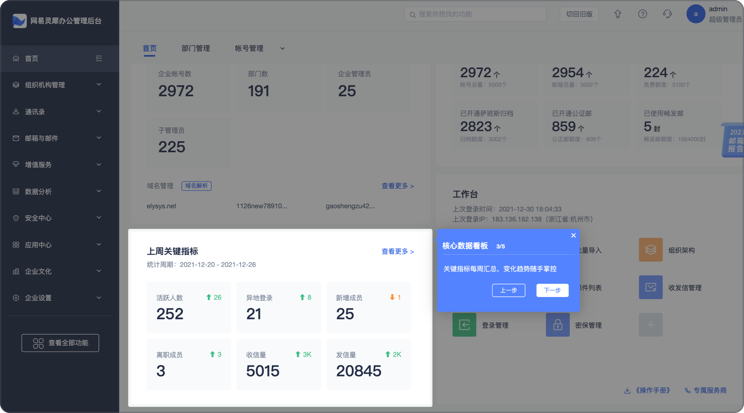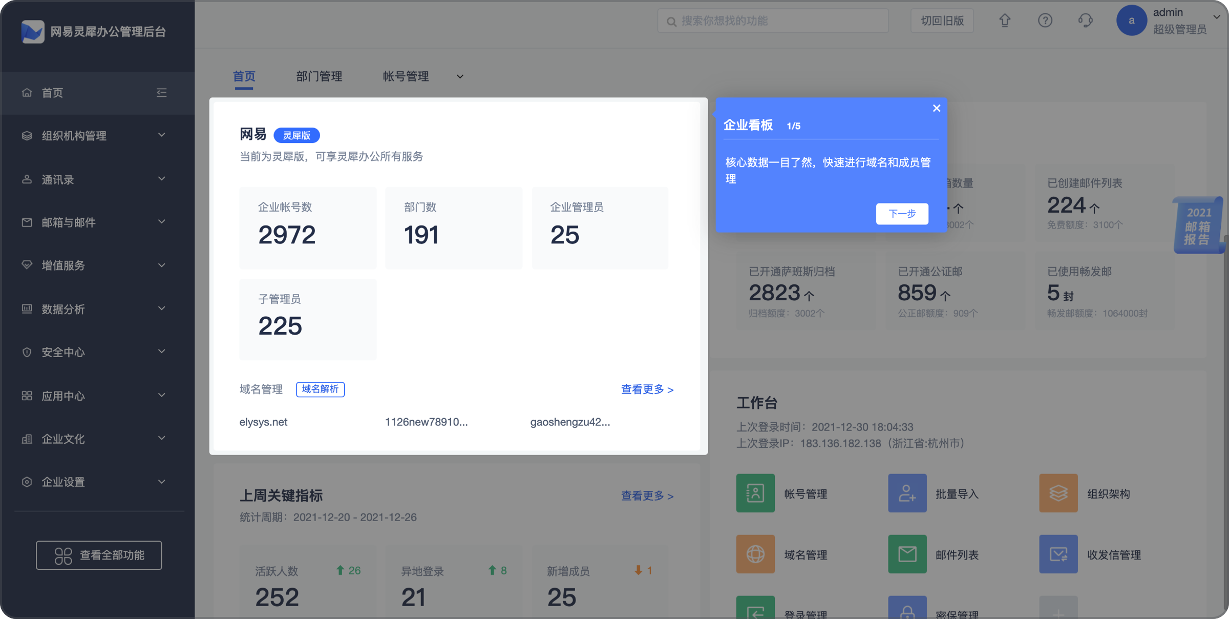 2.功能分区更明确,卡片式交互提升信息效率 (1)企业看板:核心数据一目了然 企业名称、邮箱版本、企业成员总数、部门总数、管理员数量,域名管理等,点击各个数据卡片即可直接进入对应的功能模块,查看和操作更快捷。