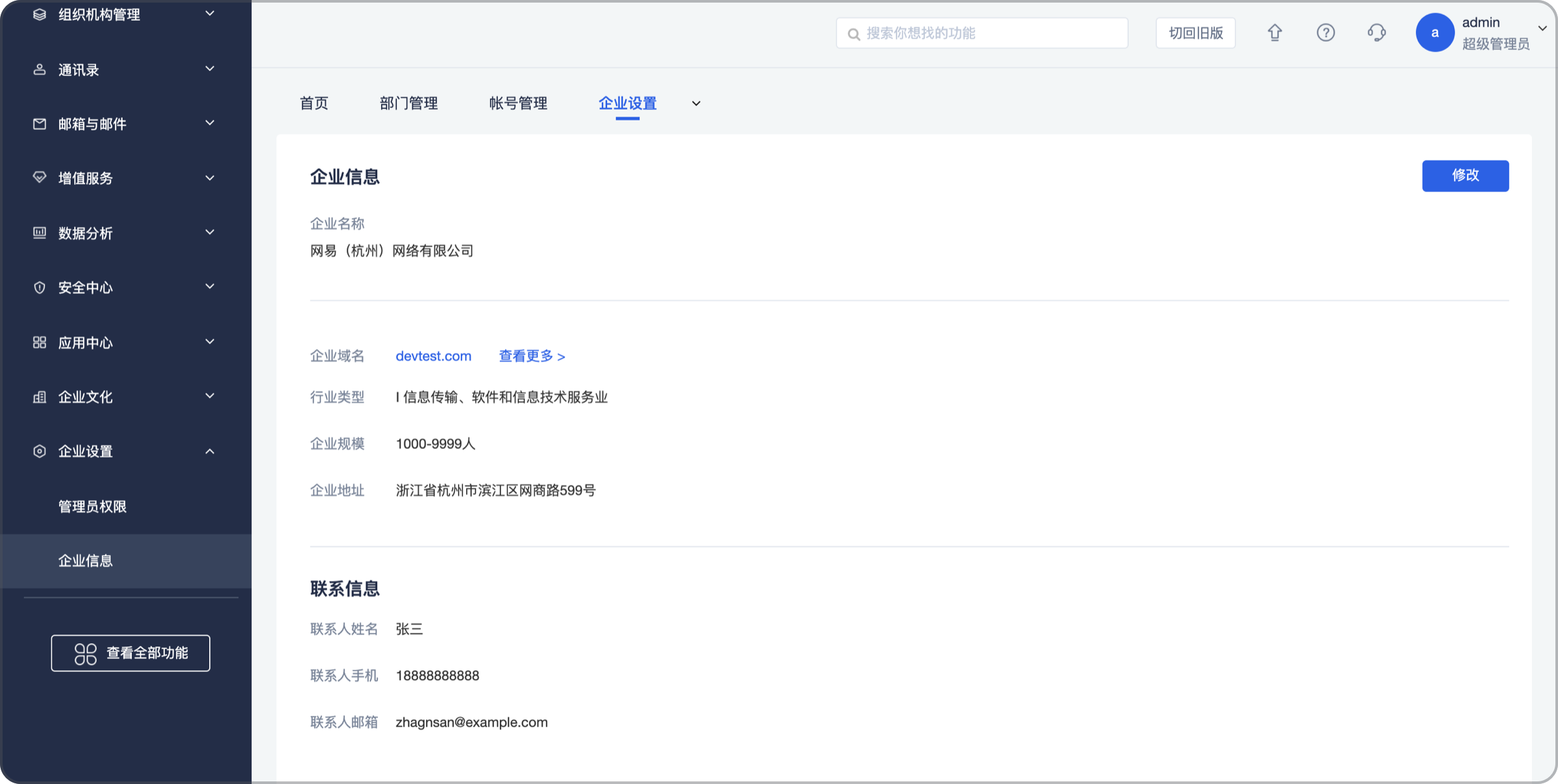 4.优化企业设置菜单,方便企业统一管理 (1)新增「企业设置」一级菜单,将「管理员权限」调整至企业设置的二级菜单。 (2)新增「企业信息」,方便企业统一管理企业信息,包括企业名称、企业域名、行业类型、企业规模、企业地址、企业联系人及联系方式。