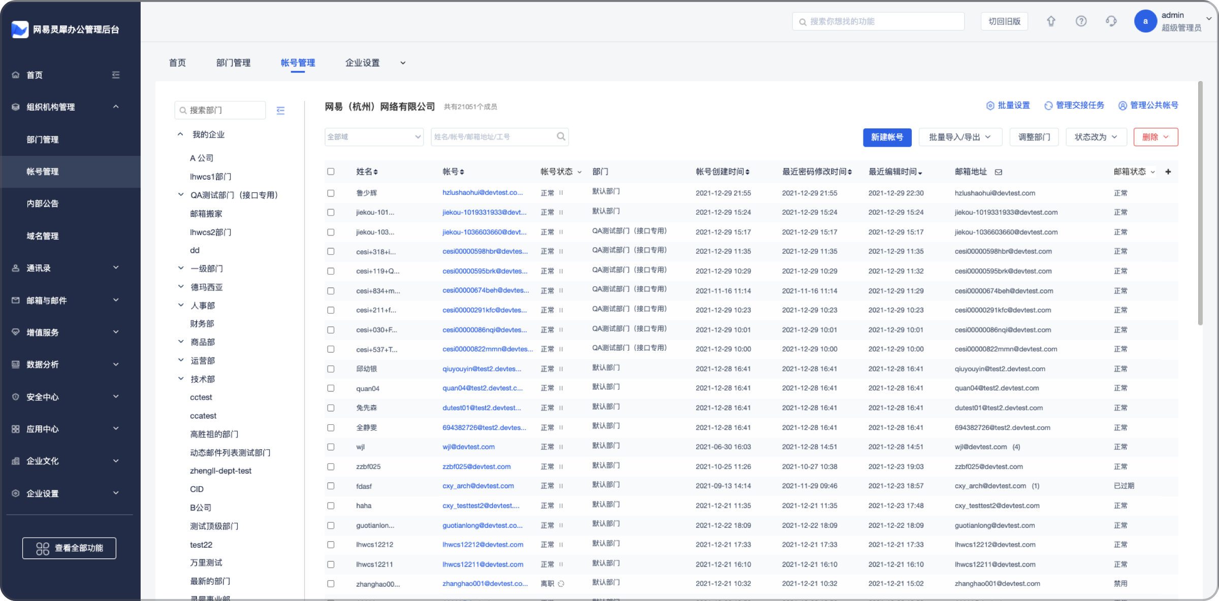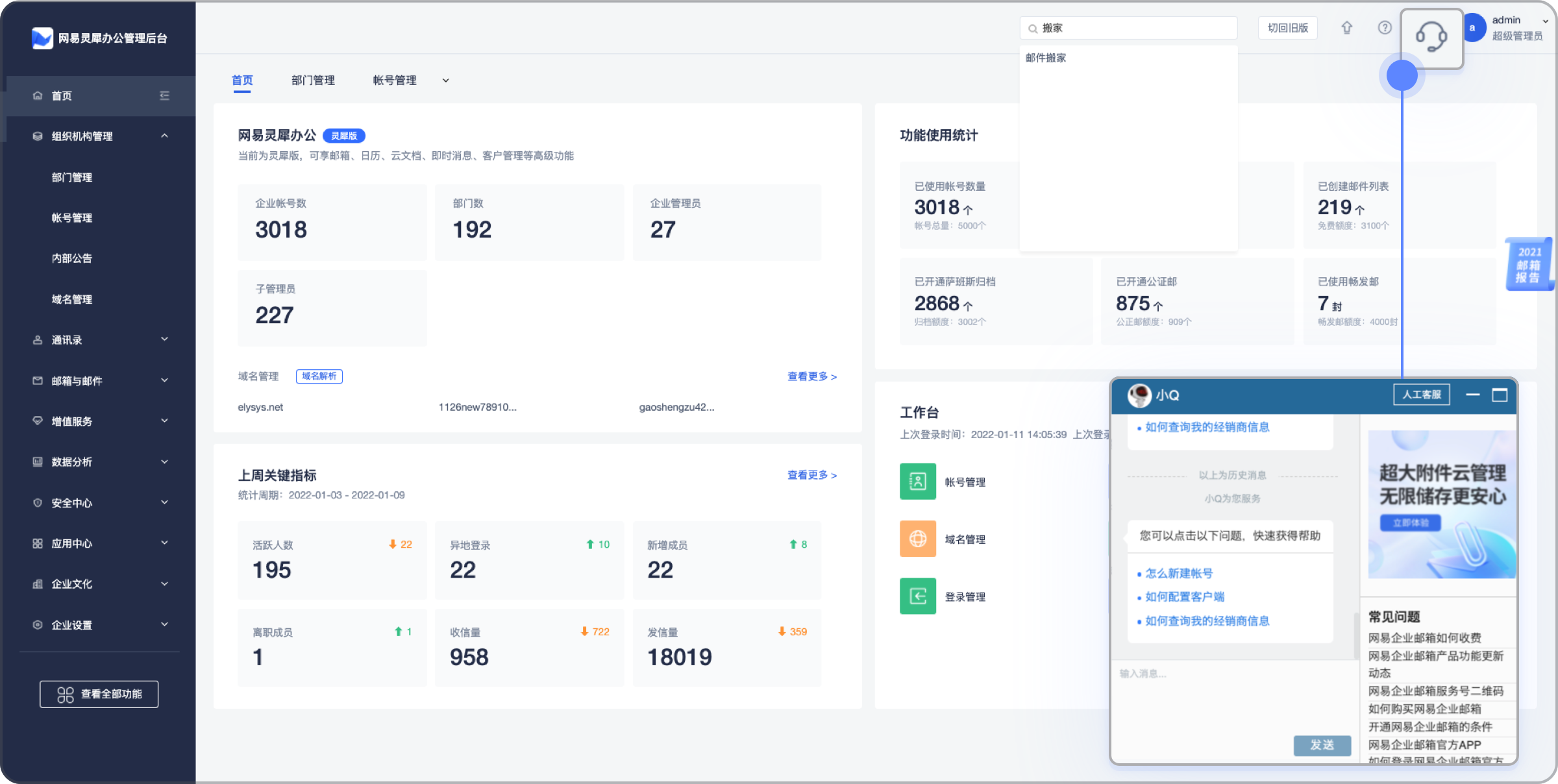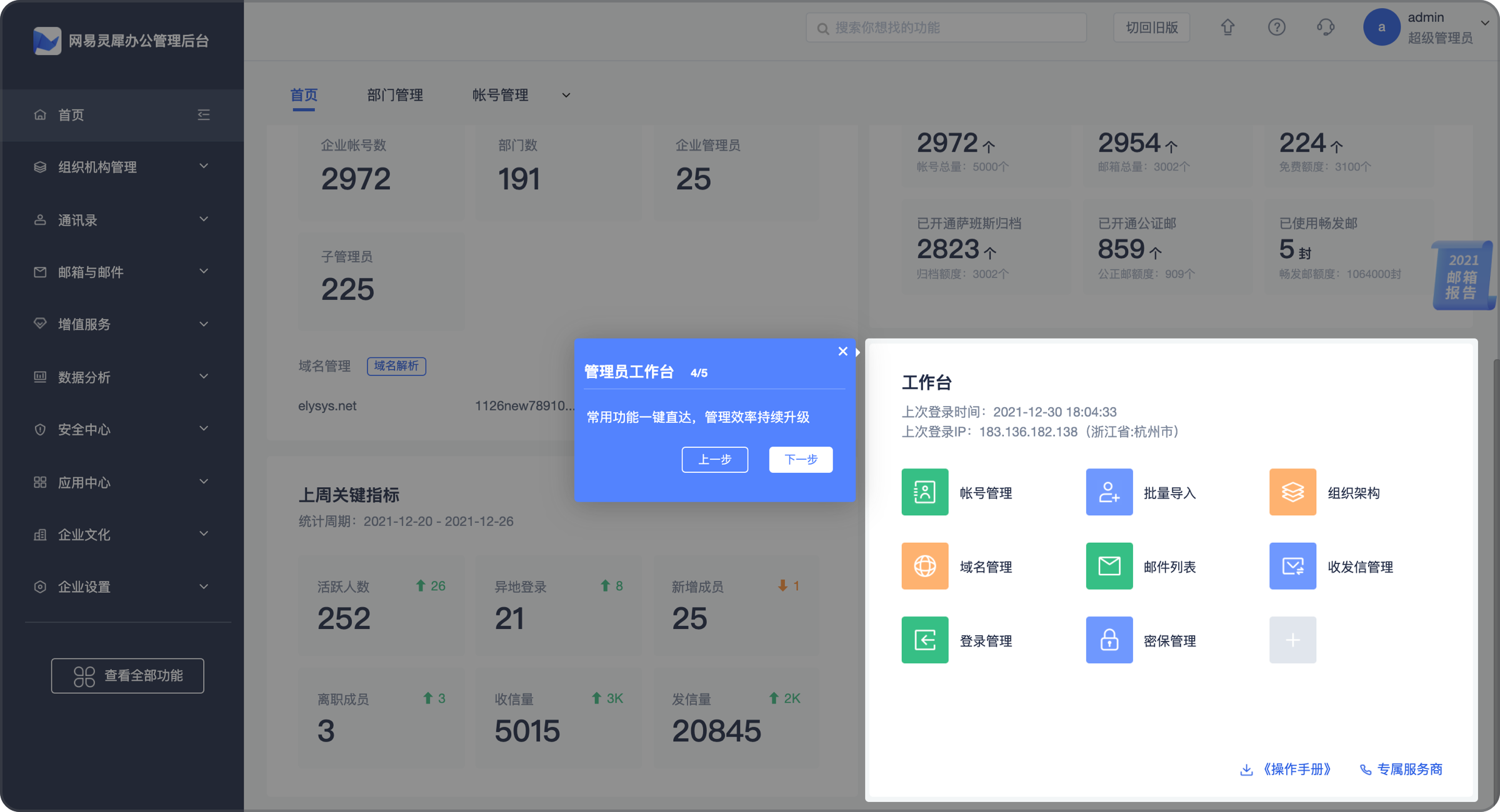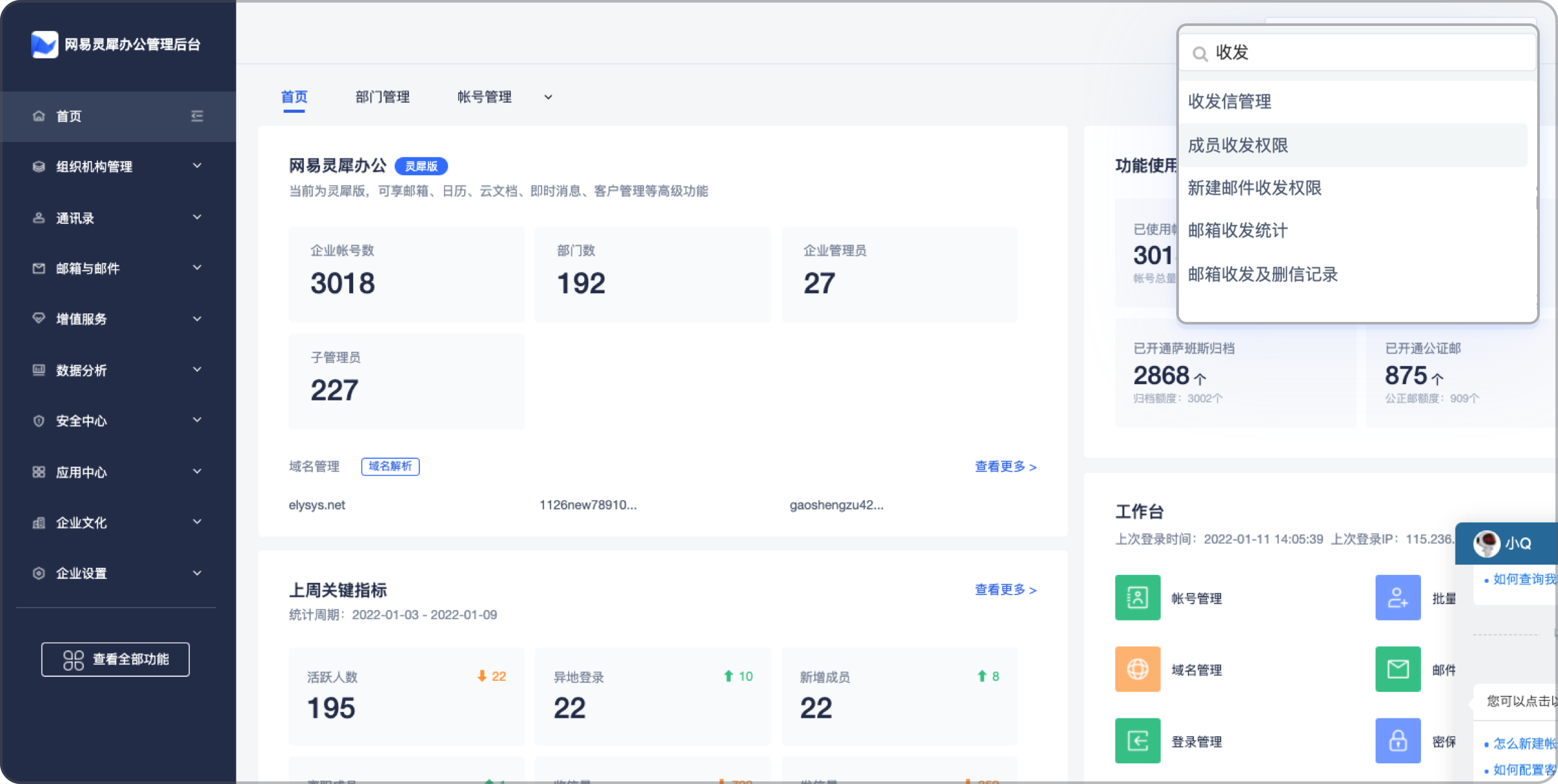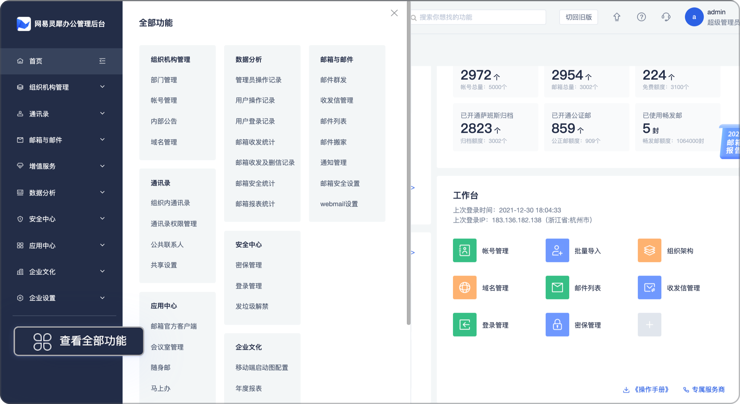 网易企业邮箱管理后台全新升级 四大亮点全揭秘在日常办公时,你是否遇到过以下问题: 1.管理后台布局功能分散,查找起来耗时费力? 2.想查找某项内容,却不能快速定位,重要信息捕捉难? 网易灵犀办公管理后台功能本周即将全新升级,本次升级覆盖了管理后台首页布局、功能分区、帐号管理和企业设置四大方面,全新界面清晰明了,为你打造极致办公体验。 1.丰富的顶部菜单栏,管理效率极大提升 (1)全局搜索:管理后台首页支持全局搜索,所有功能一目了然。升级页面支持“一键查看所有功能”,便于管理员更快地检索;支持导航栏向左折叠,释放更大的操作空间。