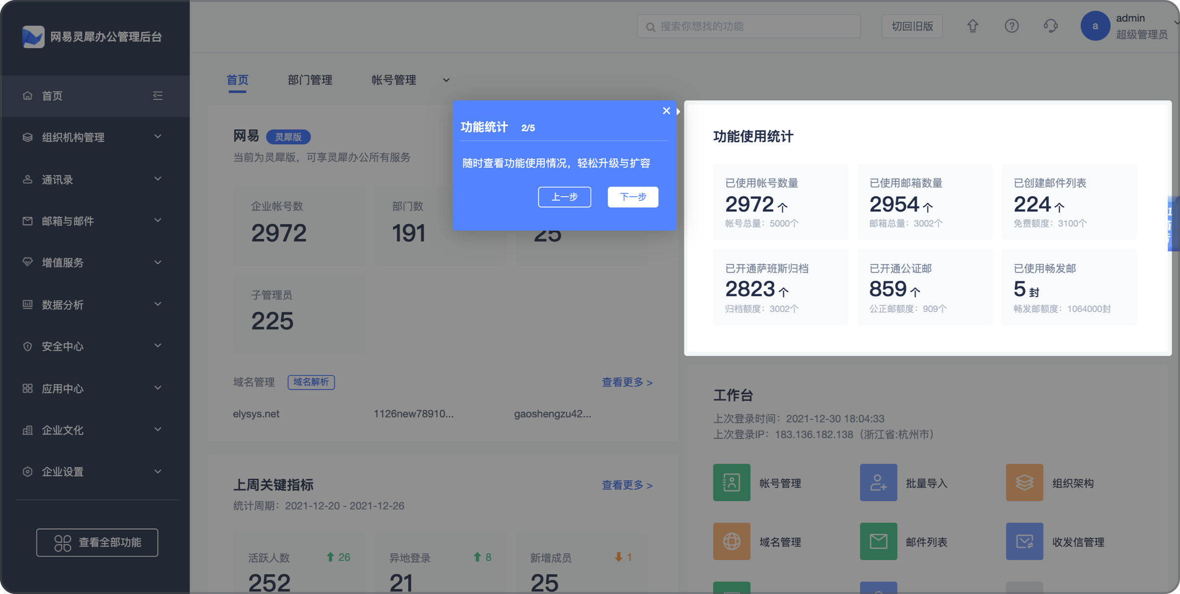 (2)功能使用统计:直观了解功能使用数据消耗情况 管理员可直观了解各项功能的使用数据,包括帐号使用量、邮箱开通数量、邮件列表创建量以及其他应用数据。