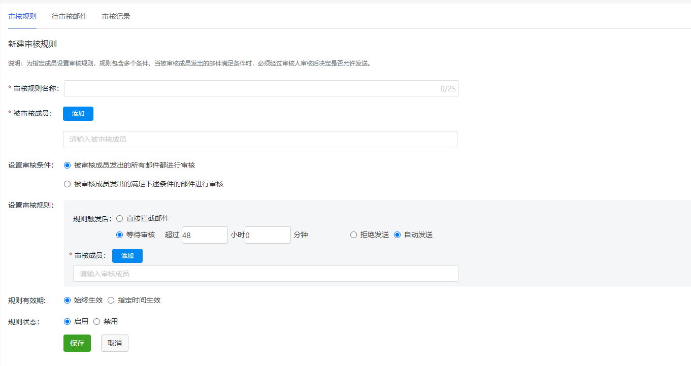 【新增】发信审核支持对成员”所有发出的邮件均进行审核“、”当发出的邮件主题为空时进行审核“;